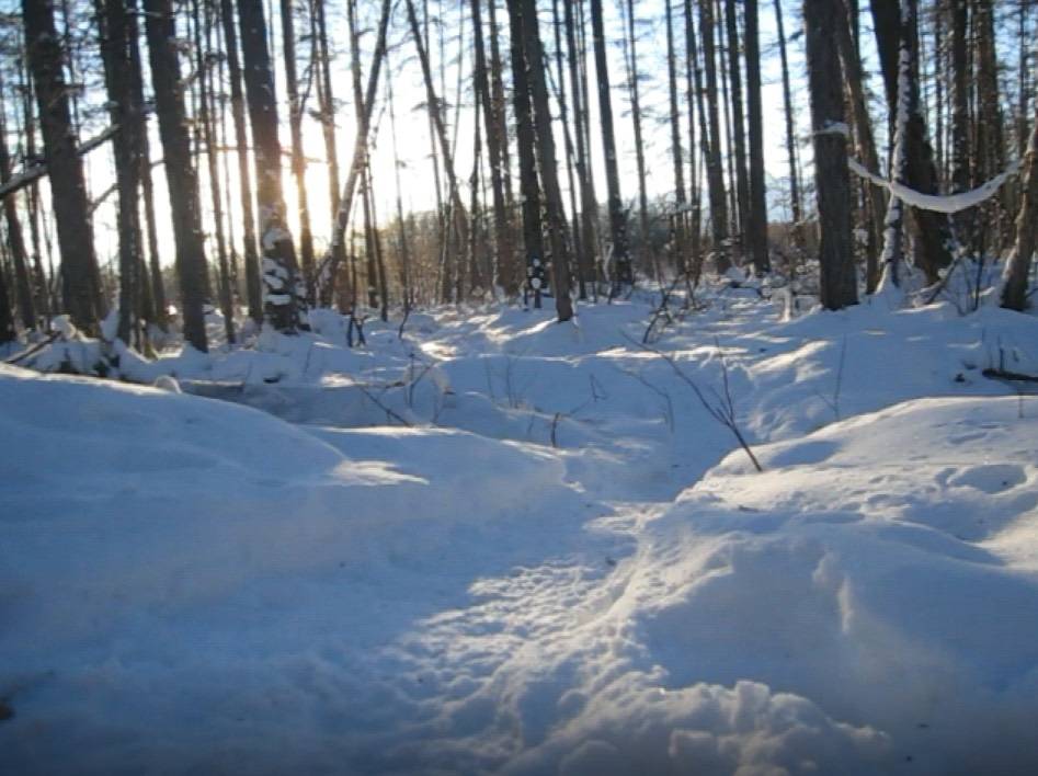 Думал, пройду немного и вернусь. Ветер стих, но мороз днем выше -20 не поднялся. Добрался до дальнего капкана на склоне сопки, захотелось подняться на вершину. Побрел, тяжело, весь склон зарос стлаником, но вид красивый: горы, лес. И вдруг, что-то черное мелькнуло, первую секунду подумал Яха мышкует. Соболь! Черный, не большой. Пока сдергивал карабин с плеча, конечно он ускакал спрятаться. Зову Яху, тыкаю носом в горячий след. Куда там, 10 метров проходит и стена стланика, слегка придавленного снегом. Следов очень много. Все избегано. Он на вершинах сопок и в непролазном стланике. Можно здесь поставить 10 капканов и назвать путик сусанинским, потому что французы здесь и без болота сдохнут. И следы белочки и горностая, все на вершинах. На лыжах туда вообще не доползешь, а пешком раз в две недели и то пока снега не навалило. Ох, ох. Тот случай, когда нужен квадракоптер, проходы в стланике поискать. Интересно, они при -20 летают? На обратном пути поднял четырех глухарей. Яха их азартно гоняет. С такой бы скоростью за соболем бегала. Подождем, когда-то же я ей покажу его живого. Пусть поймет, ради чего она через всю страну летела.