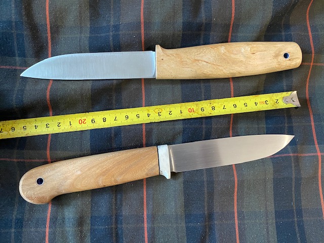 У обоих - сведение в клин от обуха до кончика и клин от обуха до режущей кромки. Рукоять - карагач. Который с больстером из рога - тот из немецкого порошка, 62 по Роквеллу. Который попроще - из быстрореза и помягче - 59. 1934