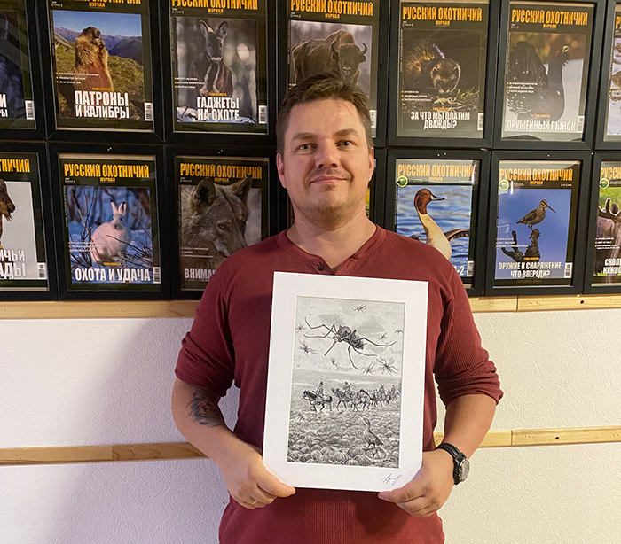 В нашей редакции - Иван Лангуев, принявший участие в опросе Рох по оптическим прицелам и выигравший офорт с иллюстрацией из "Сибирской книги".