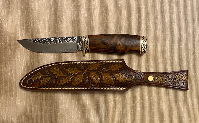 На юбилей журнала подарил мой старинный знакомый Паша Афанасьев нож. Нержавеющий дамаск, рукоять из капа каштана. Кап каштана хорош, но тяжёлый. Ножны всадные, очень тугие. Но ничего, разработаются. 1113
