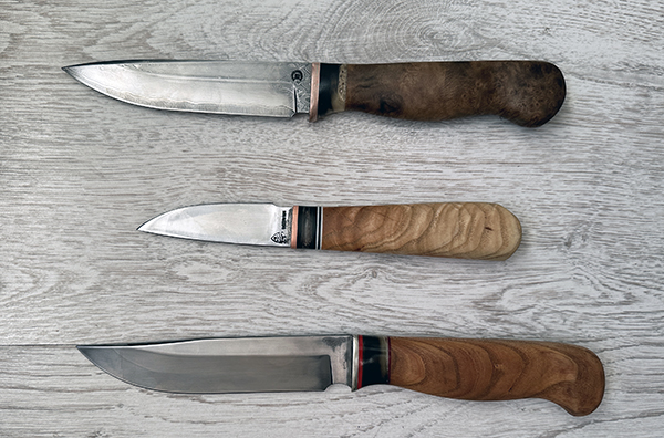 Клинок от Игоря Пампухи. Рукоять - хз что за дерево, но прочное, как чёрт-те что (источник - мастерская АРМЗ, кто в теме, тот поймёт), больстер - белый металл и рог сибирского козерога.