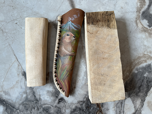 Передал мне с Камчатки Владимир Константинович Сушко заготовки для рукоятей ножей из каменной камчатской берёзы; и ножны с моим тотемным зверем - евражкой. 984