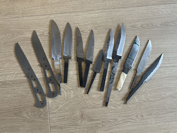 Дальше пять подряд - клинки Дмитрия Куликова - с прекрасной термичкой, все железо разное - третий слева ламинат "ломикового" типа (никак не придумаю рукоять); четвертый слева - какой-то хитрый дамаск (материал на рукоять есть, стабиленый мамонт из Хатанги); три следующих - какой-то хитрый самовар.