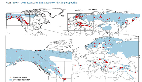 То есть - рост нападений вызван ростом численности человеческой и медвежьей популяций. Наибольшее количество нападений сосредоточено в регионах, где существует государственная система учёта таких конфликтов - то есть, в США и Европе. В РФ (на территории, где обитает от 2/3 до 3/4 мировой популяции бурого медведя) места нападений медведя на человека впрямую привязаны к местам работы и проживания конкретных исследователей по теме.