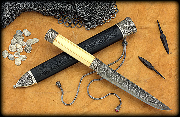 Это типа малый. Клинок дамаск с булатной лезвийный частью. 140х22х3 мм. Рукоять мамонт, белый металл. 120 мм. Ножны эбен, белый металл, гранаты.