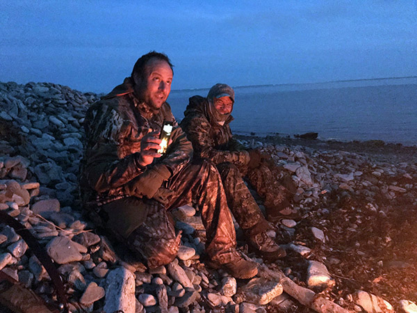 С катера высаживают двух охотников и гида.