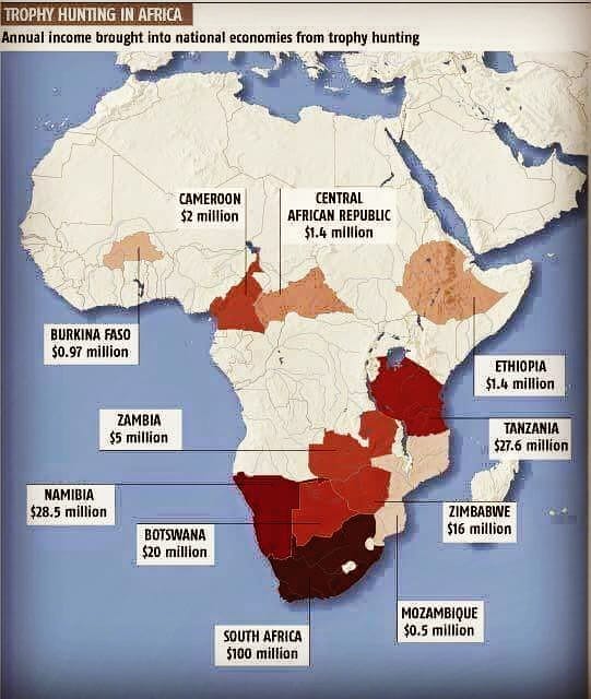 Эта карта достаточно распространена в различных охотничьих интернет-ресурсах. Обычно её демонстрируют в качестве доказательства того как благоприятно охота влияет на экономику развивающихся стран и охрану природы на их территории.