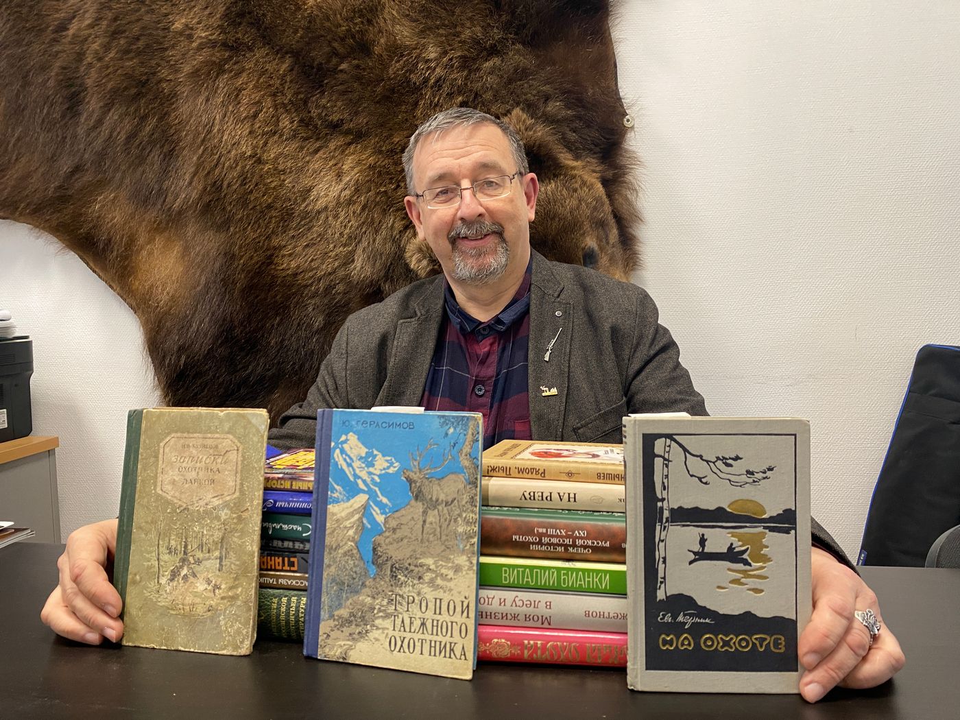Михаил Кречмар: Спасибо и вам. Да, книга Вадима Борисовича есть, вот – «Рядом, Пыж!». У меня довольно много интересных книг довольно интересных писателей. Вот, например, книга Петровского «Стакан сметаны», «Тропой таёжного охотника» Герасимова, Кузнецов – «Записки охотники с лайкой». Фёдор Абрамов – классик литературы, Астафьев, между прочим. Многие остались за кадром.