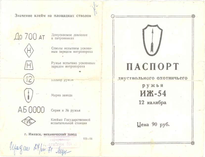 Паспорт - документ важный, а для владельца ружья, выпущенного в СССР до 1987 года - особенно. Потому что это с 1987 года стандартом стало начинать серийный номер ружья с последних двух цифр года его выпуска. До этого так делал только ЦКИБ (и то - есть нюансы), а все прочие обходились буквенной серией, причём если ТОЗ ещё как-то соблюдал алфавитную последовательность и принцип "один буква - один год" (хотя тоже - есть нюансы), то ИжМех назначал буквы серий вообще от балды. И если сейчас написать на завод, когда было выпущено ружьё Иж-54 за нумером К-1524, они ответят - 1962, 1966 или 1968 гг. Так что точная дата выпуска, в любом случае - только в паспорте.