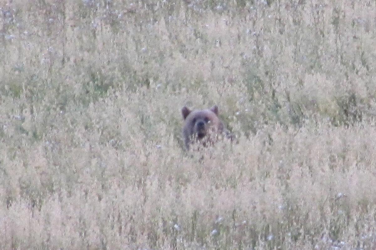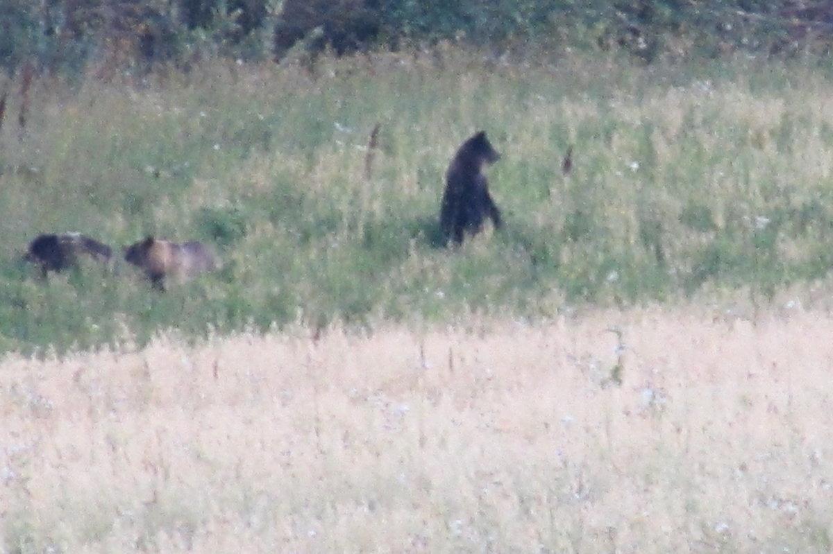 На вышке я успел поставить карабин, фотоаппарат, бутылку с водой и тут боковым зрением заметил в белом поле овса какое-то движение. Мелькнула мысль: «Они ещё и с собакой?» Выпрямляюсь рассмотреть… и столбенею – медведь! Унимаю грохот сердца – пестун, уже далеко от края поля, до вышки, на которой я даже присесть не успел, метров 40, жадно сгребает лапами охапки овса и смачно обсасывает. А за краем поля, прикрываясь кустами ивняка, тревожно мечется мамка-медведица. Я сразу окрестил её Красоткой: молодая, чёрная, когда встаёт на задние лапы, даже стройная. И всё это время, оказывается, я слышал непрекращающийся этот её разговор-подстанывание – как бы плавное тявканье, – обращённый к пестуну!