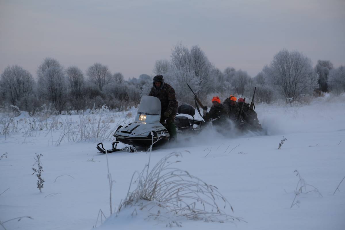 После скорого завтрака и сборов грузимся по снегоходам. База на момент нашего приезда располагает единственной оставшейся на ходу «Ямахой» и пожилым грузовичком «ГАЗ-66», переделанным из «санитарки». Нас 10 человек, поэтому мы привезли еще два снегохода с санями, чтобы быстрее развозить стрелков по номерам. Большинству охотников приходится ехать в санях, получая бесплатный курс жесткого массажа. Первый загон совсем небольшой – нужно всего лишь встать подковой вокруг обширного и «крепкого» кустарника.