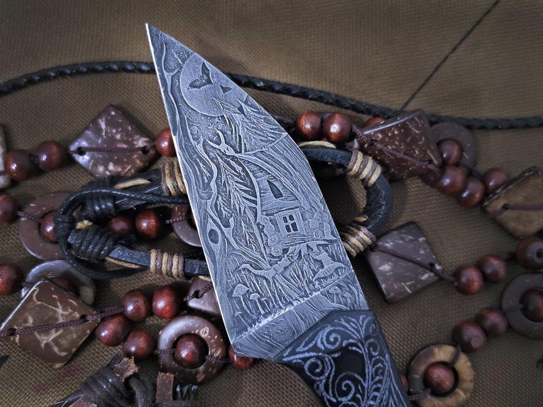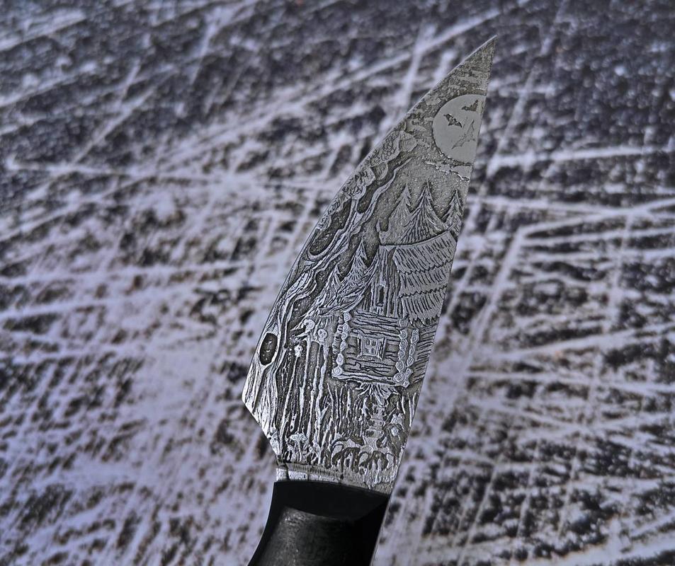 Особенно, конечно, выделяются сами клинки. Многоуровневое травление поверхности клинка заставляет всматриваться и подмечать детали: шагающая избушка на курьих ножках с черепом и рогами на крыше, ухающий филин, недобро расправляющий крылья, нетопыри на фоне полной луны, летящая в ступе Баба-яга, чьи-то глаза, светящиеся в темноте, и аленький цветочек, путь к которому лежит через тёмную чащу.