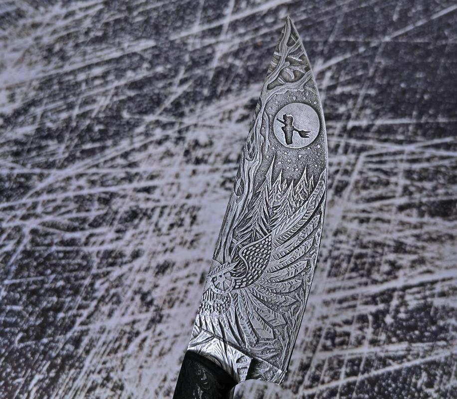 Отличия, прежде всего, в исполнении: рельефном травлении глубокой детализации в вышеописанном стиле и строгих чёрных рукоятях. Да, «Волчий Век» известен своими яркими кастомными изделиями, но эти ножи у них получились совсем другими. Впрочем, ножи этой линейки тоже вышли яркими, просто по-своему – с какой-то особенной суровостью и глубиной.