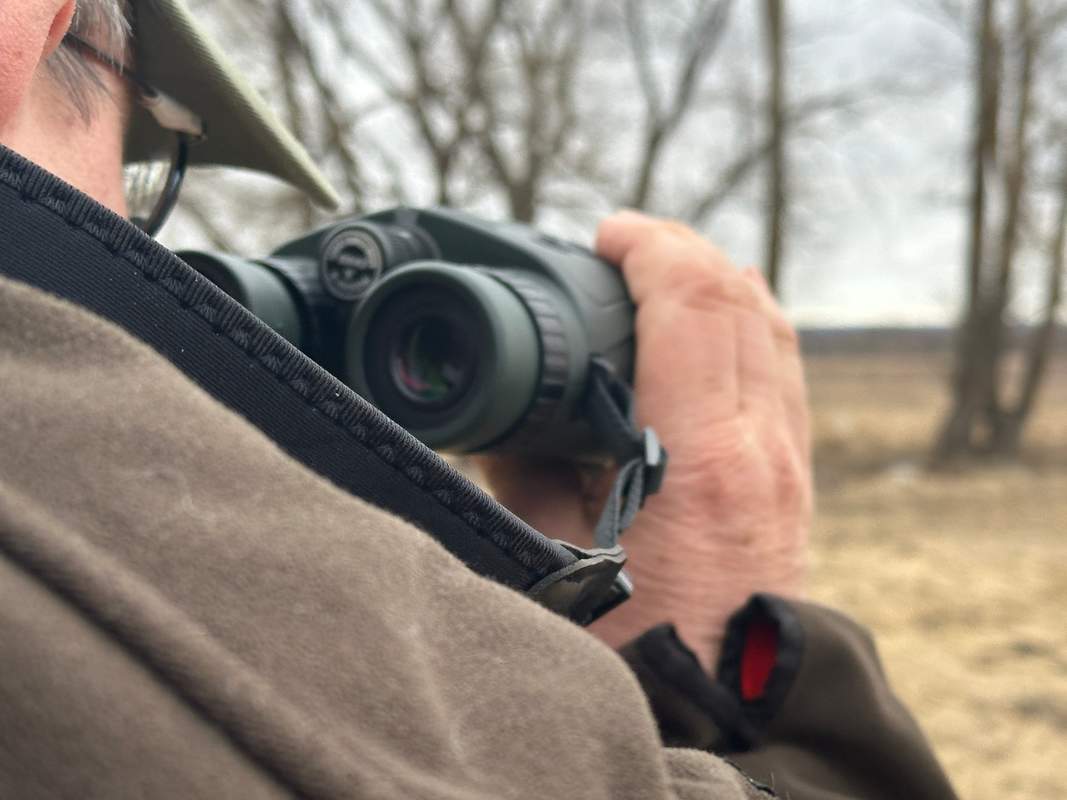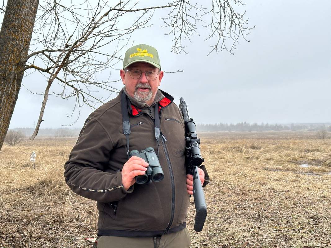 А вот где я к скромной цене не привык – так это в дальномерных биноклях (у самого восьмикратный Swarovski El Range). Ну что – попавший мне в руки Veber RTFS1000 оказался биноклем уже другого поколения. Хорошая светлая оптика, обрезиненный компактный (для десятикратника) корпус, хорошо знакомая батарея CR2… Крупные чёткие марки-указатели, хорошо читающиеся цифры прекрасно смотрелись на фоне туманных полей, временами подёргивавшихся плотной пеленой дождя, а то и зарядами снега. Дальномер постоянно отслеживал крутившийся вдалеке квадроцикл, сканируя скорость его передвижения от 5–6 до 20 км/ч и дальность до него в 560–800 м. Дальность в 900 метров прибор показывал легко, а больших дистанций на наших полях, увы, не оказалось. Накатывающий от дальних лесополос слабый туман тоже оказался «к месту»: в тумане я определял точки, находившиеся в 300 метрах от стрелка, то есть на максимальном расстоянии, когда в тумане можно было хорошо различить объект.