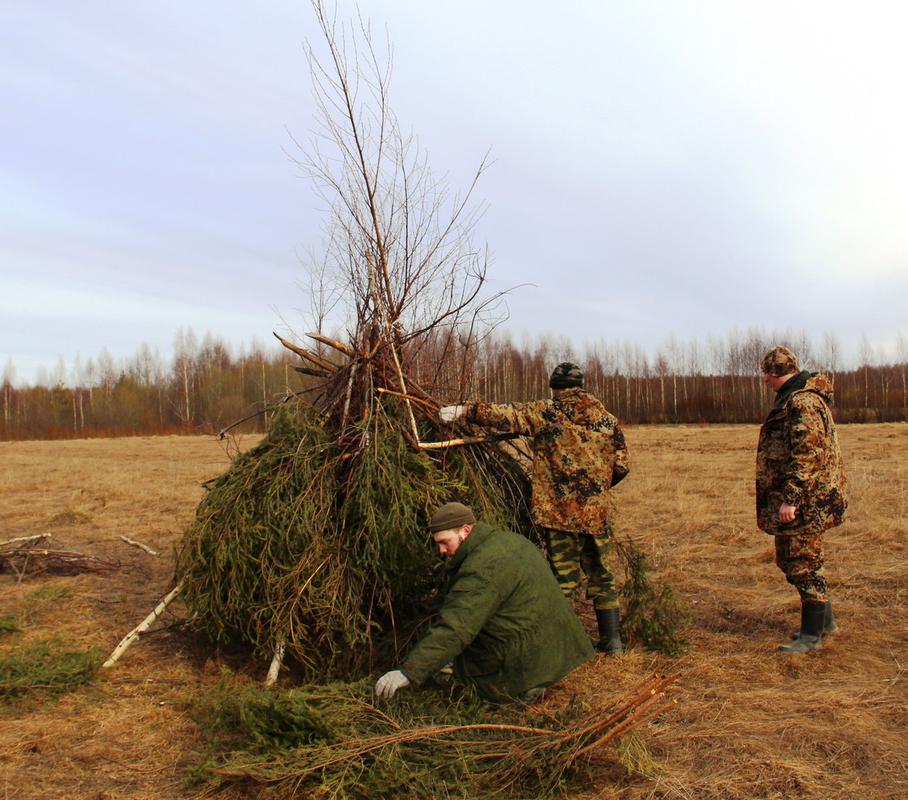 Первый охотничий день начинаем с самой сложной охоты – на глухаря. Разбившись по парам – один местный + один гость, идем на два разных тока. Выходить приходится в начале первого ночи – с таким расчетом, чтобы часам к трем быть на месте. Путь длиной около 8 километров пересекают многочисленные затопленные весенним паводком участки. Первое ночное хождение по лесу оставляет неизгладимые впечатления – в темноте все ветки метят в лицо, и я никак не могу свыкнуться с темпом, задаваемым Алексеем. К току подхожу насквозь мокрый – одевался-то тепло, предупрежденный о возможности получасовых замираний при ожидании нужного колена песни. Еще в полной темноте пытаемся услышать заветное точенье. Внезапно – кажется, прямо над нами – раздается одиночный «клак». Как потом мне поясняет Алексей – это подают голос молодые петухи, еще не способные на полноценное токовое поведение. Соответственно, осознанно подойти к ним обычно невозможно, и охоту они часто портят своими неожиданными слетами. Постепенно начинает светать, а полноценного токования не слышно. Начинаем потихоньку передвигаться по току, который раскинулся в длину на сотни метров. Слышим несколько встревоженных копалух, слетает c дерева «молчун» – петух, не подававший голоса.