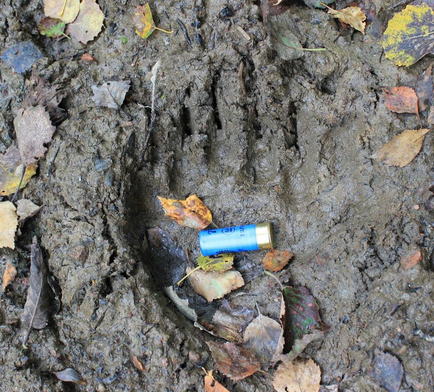 На следующий день я снова вышел в лес, однако в этот раз испортить всё решила погода. Очень сильный ветер качал высокие сосны и завывал в их кронах. Никакие рябчики в такую погоду, конечно же, не отзывались. Поэтому мне пришлось довольствоваться вчерашним результатом и впечатлениями от простой прогулки по настоящему лесу, который не так часто раскрывает свои объятья южному охотнику. Сосновый бор радовал меня своей неувядающей зелёной красотой, чудесным лесным запахом и многочисленными следами кабанов и лосей. Дополнительную остроту в эти ощущения привносили лаконичные отпечатки медвежьих лап, изредка встречавшиеся на грязи. Уже на выходе из леса, метрах в 100 от меня на дороге я увидел 2 енотовидных собак, которые тут же начали быстро удаляться своим неуклюжим переваливающимся бегом, напоминая этаких лохматых колобков. А на следующий день уже пришла пора ехать домой. И даже несмотря на очень скромный результат, я остался доволен поездкой: радость от добычи первого рябчика пересилила дальнейшие неурядицы. А уж полноценное общение с природой лесного края, как всегда, надолго оставило свой тёплый след в душе южного охотника.