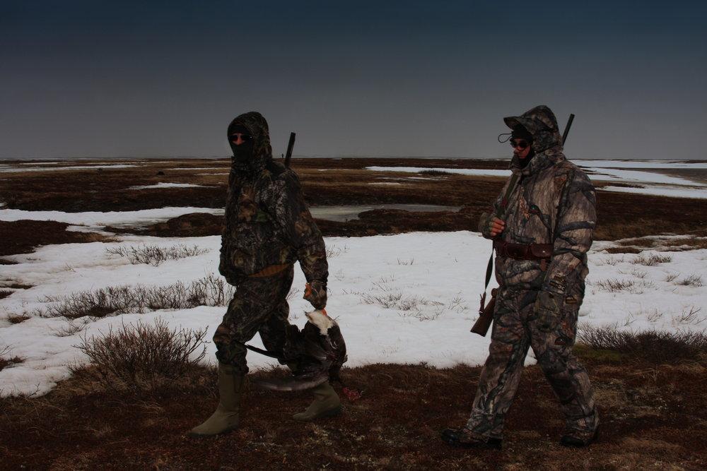 При перелётах птицы, как правило, придерживаются береговой линии или полосы приморской тундры шириной один-два километра. Отдыхают гуси в так называемых лайдах – устьях рек, находящихся в приливно-отливной зоне. Вот в их окрестностях и располагаются стрелки. Ещё одна отличительная черта этой охоты в том, что привычная для охотников на гуся многоуровневая система маскировки тут, в общем-то, не очень и нужна, достаточно обычной камуфляжной одежды и белых маскхалатов. Мне не приходилось встречать серьёзных укрытий, врытых в землю (слишком близко вода), хотя и здесь используются скрадки, укрытые мешковиной или фанерой тёмного цвета. Бывают засидки, сделанные в виде недостроенного снежного иглу или вообще из пустых железных бочек, которых птицы совсем не боятся. Профили и полноразмерные чучела, конечно, используются. Также можно использовать и добытых гусей, которых ставят рядом с профилями. К ним, как правило, подсаживается местный гусь, ходовой гусь обычно проходит мимо, приземляясь в случае непогоды либо если собрался отдыхать или кормиться.