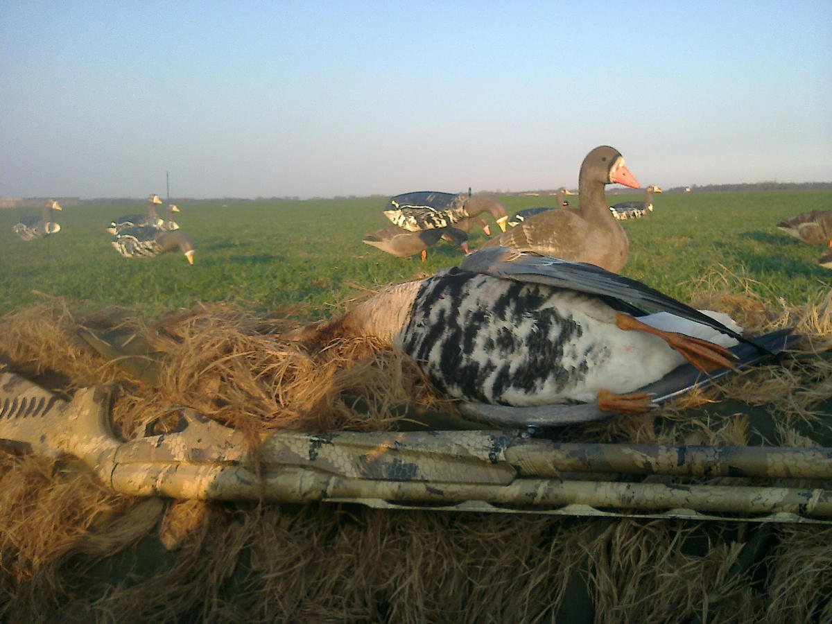 Чучел на поле должно быть как можно больше, тем более что это и обстановка позволяет. Я использую порядка 100 штук. Среди них имеются и стая канадской казары (флюгера), и парящие флюгера, полнообъемные чучела гуменника и белолобого гуся. На поле лучше всего охотиться одному или же использовать раздельные ямы на каждого охотника, так как гусь на поле очень осторожен, и большой скрадок на 2-3 человека может гусей испугать.