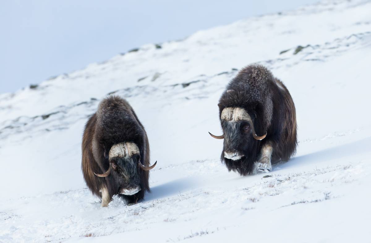 Не откочёвывает в лесотундру по-настоящему арктический вид копытных (и единственный, наверное, которого можно так назвать) – овцебык. Он способен питаться такой малостью, что даже чемпион номер два по выживанию в суровых климатических условиях – снежный баран – кажется по сравнению с ним гурманом Лукулловой школы. И да, снежный баран тоже встречается в Заполярье, но проникает туда по свойственным местообитаниям – хребтам и плато. Он, в общем-то, и южнее живёт в местах немногим лучше.