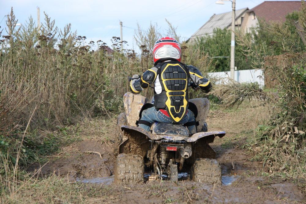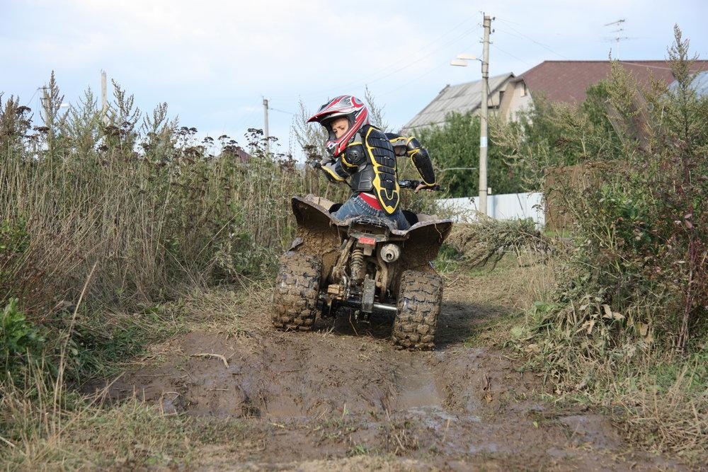Получилось проверить квадроцикл и в преодолении небольшого, но весьма крутого оврага, залитого водой, чему они тоже постепенно научились: и эта водная преграда с летящей из-под колес в лицо грязью, наверное, стала для них одним из любимых препятствий.