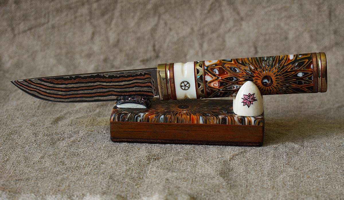 Константин – жуткий работяга. Встаёт в пять утра и сразу становится за работу. Это большой недостаток совмещения жилья и рабочего места. Работает он очень быстро: утром показал мне заготовку насаженного ножа с начерно собранной рукоятью – а вечером уже присылает фото готового изделия. А ещё Константин – очень доброжелательный человек и с готовностью учит других мастеров тому, что умеет сам. Это я не от него, от посторонних людей слышал.