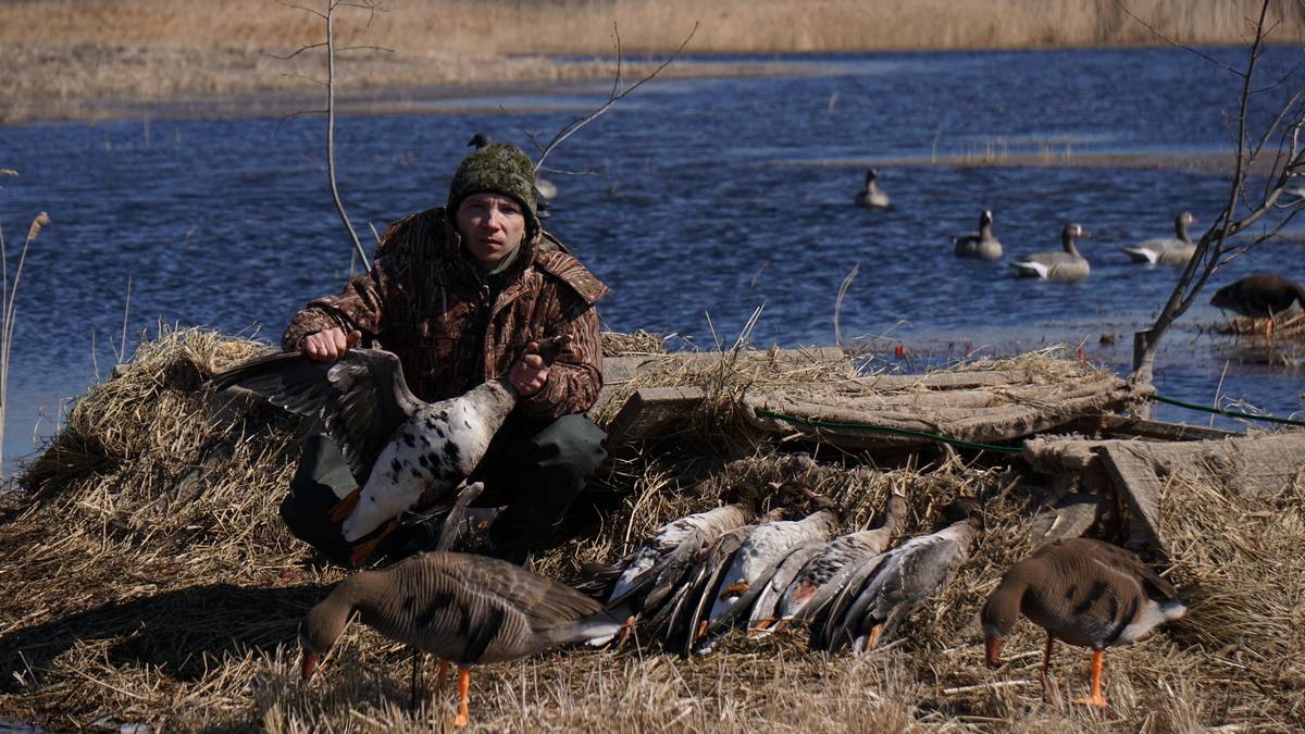 Вся неделя прошла на отличной ноте. Были промахи по лесным куликам, были и добытые. Шёл снег и дождь, а также были солнечные дни, которые вытапливали последний снег с опушек леса и полей. Кое-где в лесу оставались снежные кочки, а ещё прилично в оврагах, но это не главное. Сама по себе тяга очень интересна: есть время насладиться пением лесных птиц и в этом хоре дождаться своего «цвырк-цвырк». Знакомые гусятники всю эту неделю просидели, ожидая пролёта гуся. В пятницу, когда погода перешла на среднесуточный плюс, гусь массово пошёл. Главный гусятник предложил нам посвятить один день гусиной охоте. Мы, конечно, согласились. Это был ещё один запоминающийся день.