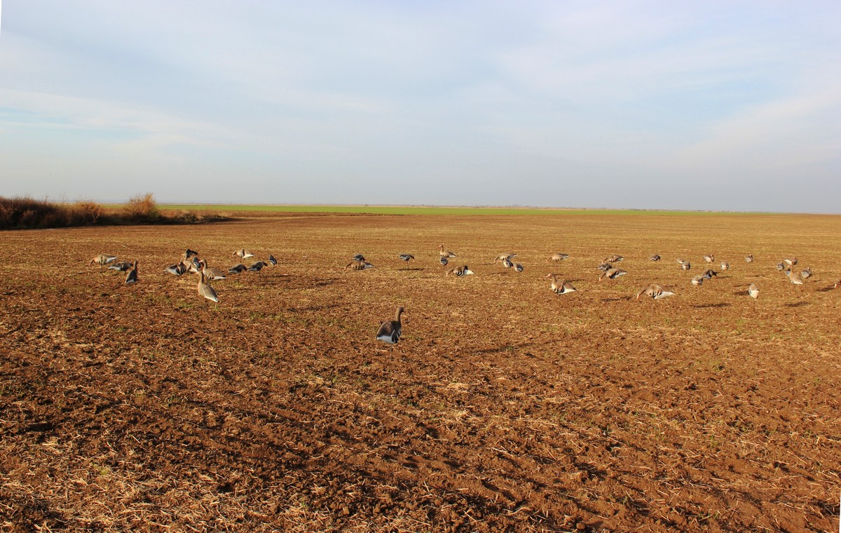 Конечно, удачным в плане гусиной охоты бывает не каждый год. Но прошлый запомнился рядом неплохих зорек. Лично у меня получилось поучаствовать в трёх из них. Причём, что бывает нечасто, все они прошли на одном и том же месте, у одной и той же присады, которая, как обычно, была найдена Денисом. Около тысячи гусей сидело на поле уже достаточно хорошо взошедшей озимой пшеницы. Скрадок был оборудован на соседнем поле пшеницы, между присадой и большим лиманом, где гусь ночевал. Правда, здесь ростки озимки ещё едва-едва пробивались. Зато в удобном месте росло низенькое деревце, из которого после дополнения принесёнными ветками и травой получилось неплохое укрытие.