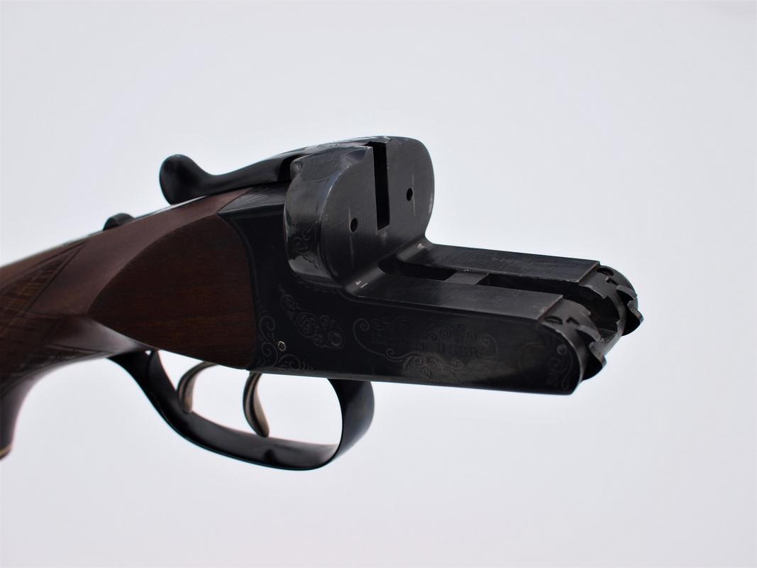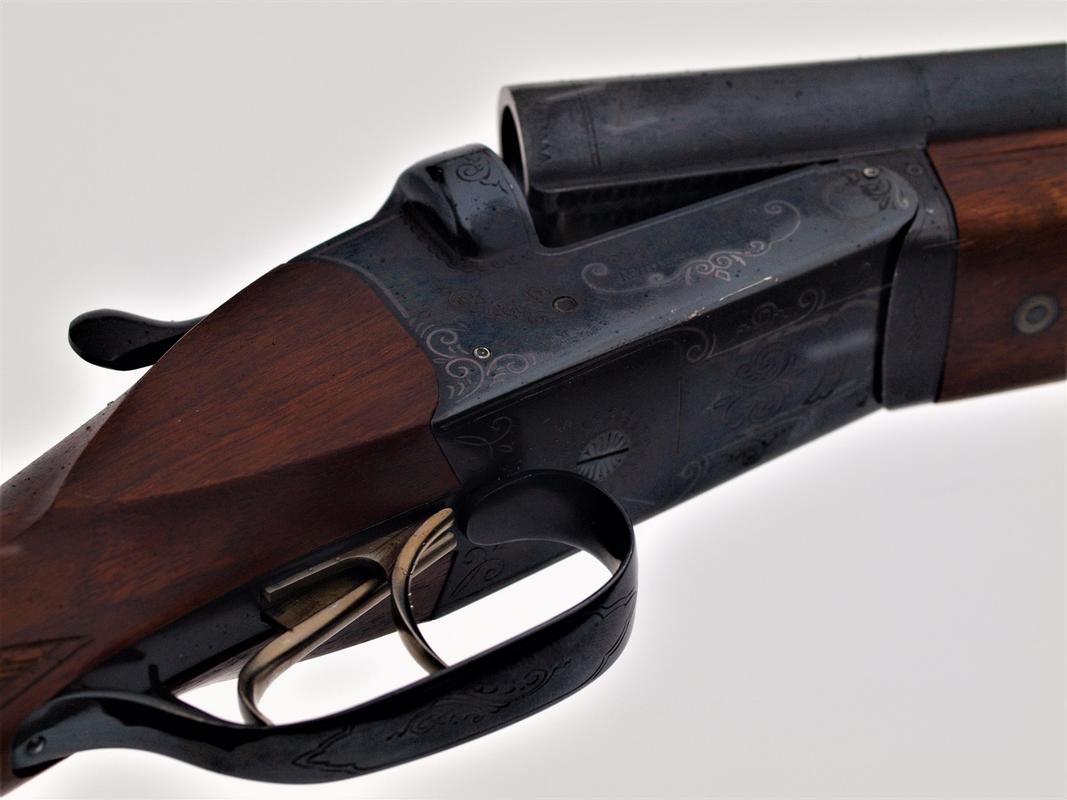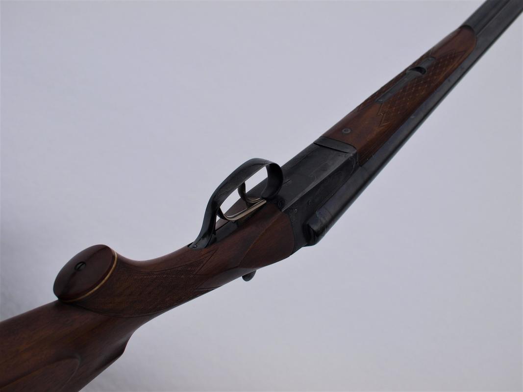 На фотографиях вы видите ИЖ-58 в классическом штучном исполнении весом около 3 кг. Выпущенное в 1966 году ружьё имеет патронник 16/70 мм, ствол длиной 725 мм с сужениями чок и получок, двухспусковой механизм, неавтоматический ползунковый предохранитель и экстрактор. Розетка на пистолете, белые вставки, дарственная табличка, насечка шотландкой, приклад из благородного ореха и выгравированная надпись Made in USSR – всё это придаёт ружью лоск, позволяет догадаться, что этот экземпляр предназначен на экспорт. Это не было редкостью: ИЖ-58 очень ценили на мировом рынке за стойкость, качество, скромный шарм и конкурентоспособную цену.