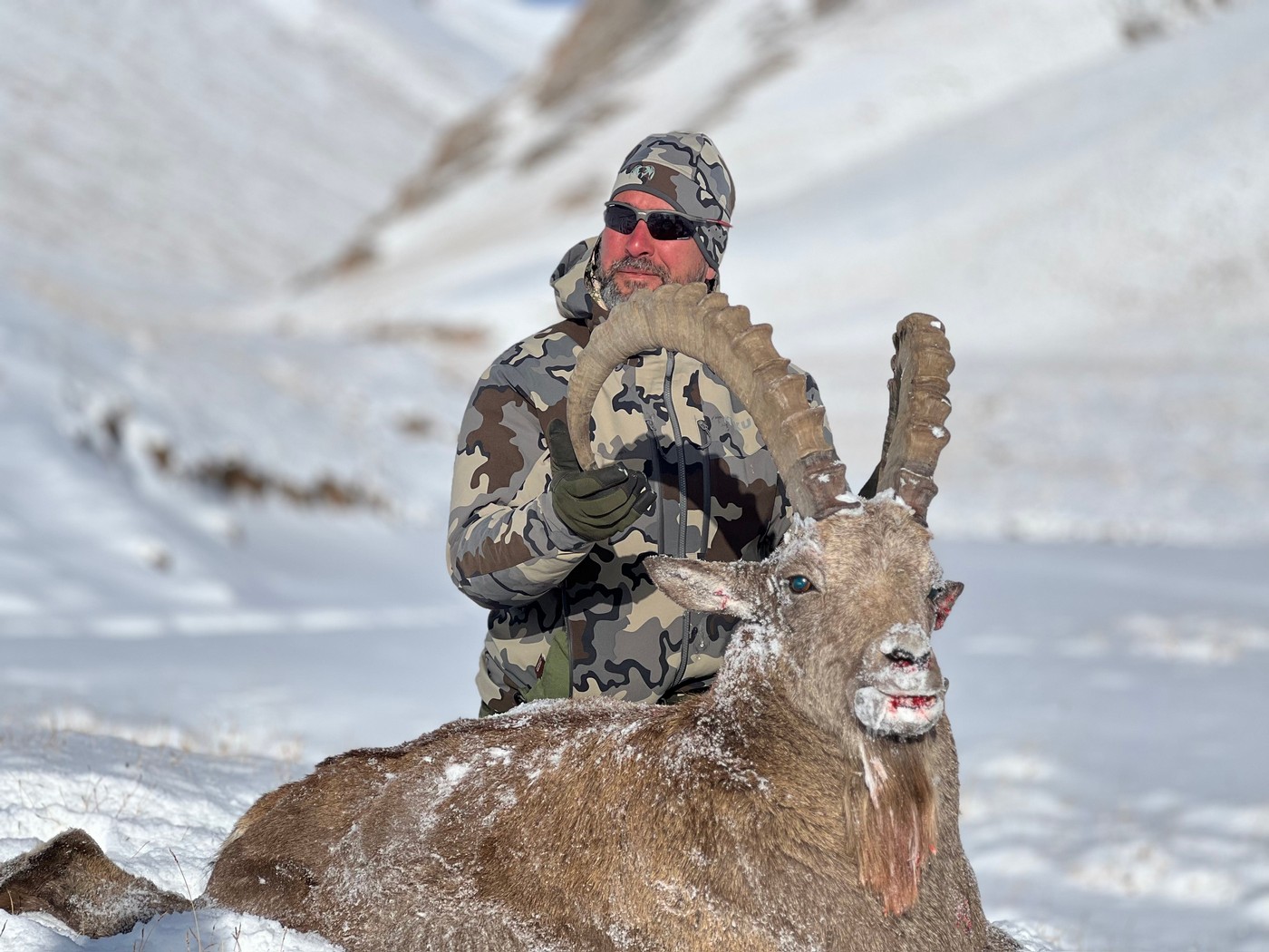 Пройдя дальше, мы увидели группу самцов, которые медленно поднимались по склону в 350 метрах от нас. Так в первый же день охоты моим другом Андреем был добыт наш первый трофейный козерог. Мы коллективно выбрали рогача понаряднее. Тренер Сергей, как и ранее на тренировках, задал точную дистанцию 418 метров, угол +18 градусов. Андрей докрутил барабан и убрал кратность до 12. Выстрел! Рогач, как подкошенный, скатился к подножию склона. Интересно, что его собратья никак на это не отреагировали. Меланхолично проводив товарища взглядом, они продолжили движение вверх по склону, просто чуть ускорив шаг. Все оставшиеся дни мы гонялись за моим трофеем.