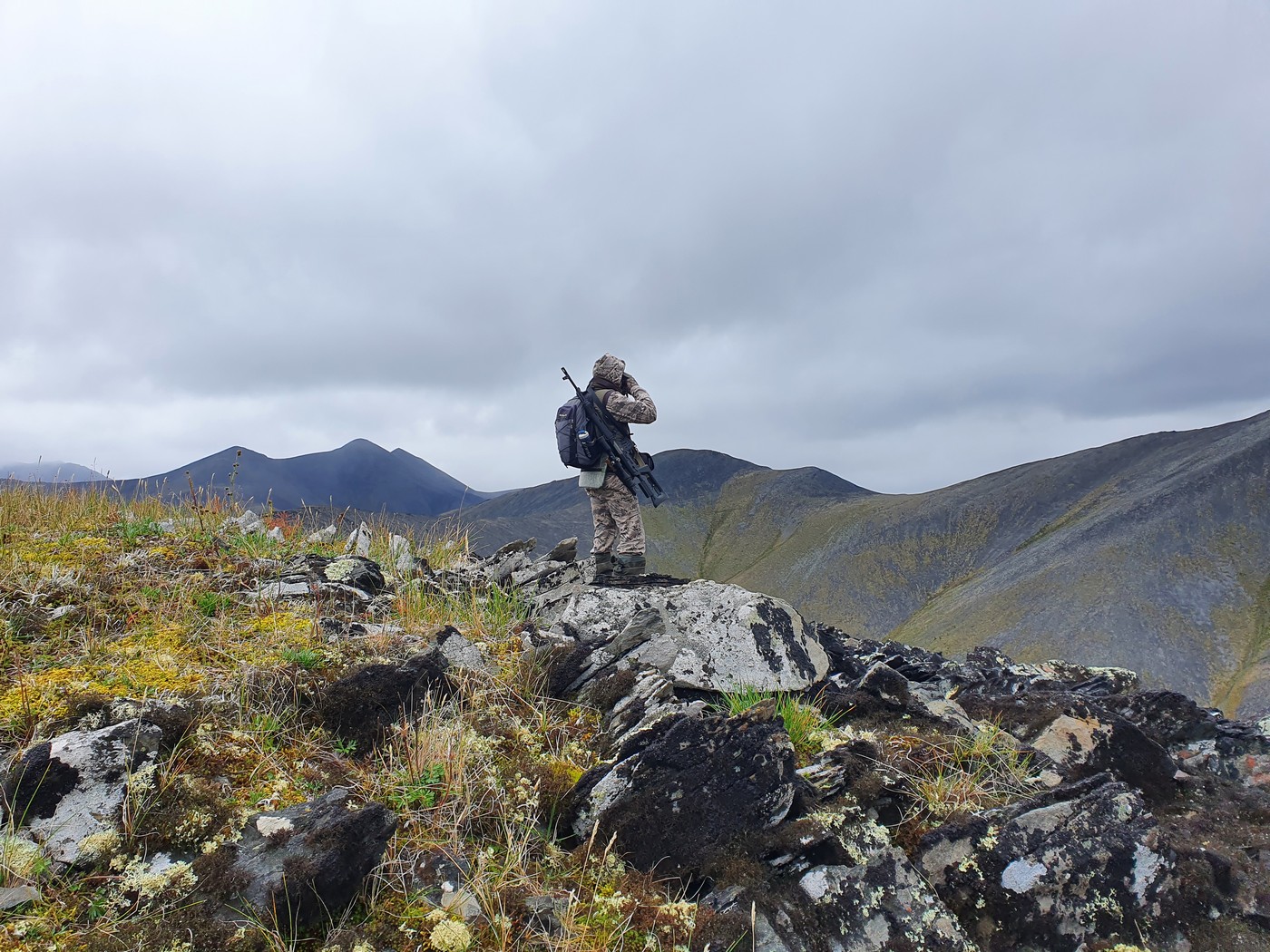 Во второй половине дня на противоположном склоне на расстоянии около двух километров увидели трёх баранов, один из которых имел очень неплохие рога. Заметили не только мы их, но и они нас, что не вызывало у них никаких эмоций: они продолжали лежать. Нас разделяли уходящий вниз склон, ручей в низине и склон, поднимающийся к ним. Я решил, что смогу подойти. Договорились, что Никита останется у баранов на виду, отвлекая на себя их внимание. То есть он должен был периодически без резких движений двигаться, но не в сторону баранов. Я планировал скрытно спуститься за гребнем, подняться с противоположной от баранов стороны и подойти к ним сверху. Рации у нас не было, а спутниковый телефон – один. Поэтому договорились, что, когда я появлюсь над баранами, Никита, обнаружив меня в трубу, покажет рукой, в какую сторону мне двигаться. Увидеть его жестикуляцию я надеялся в бинокль.