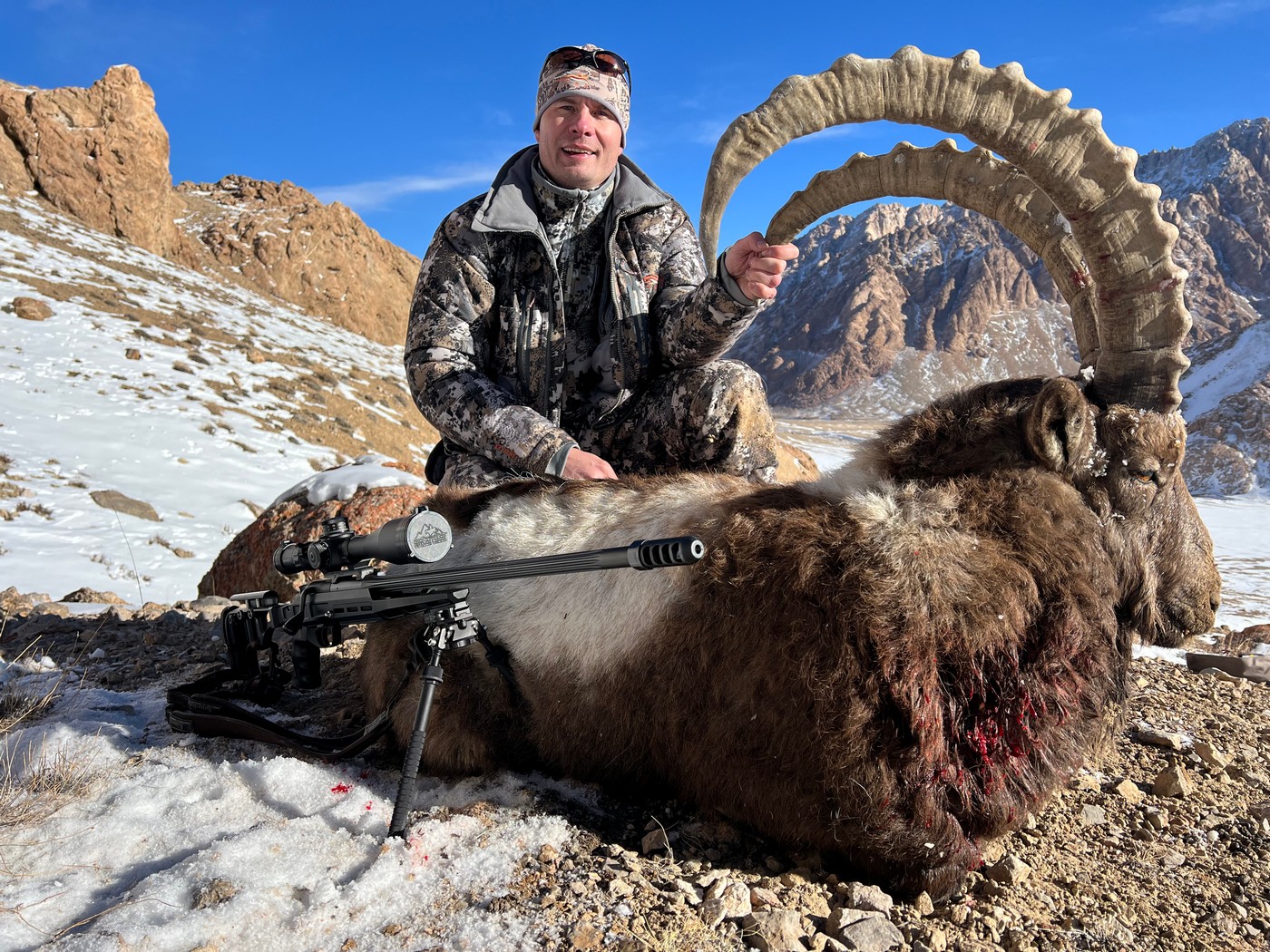 Вторая попытка с подстраховкой проводников добраться до заветного места увенчалась успехом. Но позиция была крайне неудобной, и пришлось забраться на соседний камень, карабкаясь по плечам и голове проводника. В итоге, схватив адреналин от такого восхождения, я не смог адекватно произвести выстрел и промахнулся. Через день выдался повторный шанс. Уже под вечер, в сумерках подобравшись к группе козерогов на 600 м, используя наработанные навыки выстрела в сильный ветер, делая вынос по сетке из-за замёрзшего барабана горизонтальных поправок, смог добыть трофей. Пусть не выдающийся по размерам, но очень запомнившийся по сложности охоты. Возвращение по ущелью «со щитом» позволило не обращать внимания на мороз и ветер, а наслаждаться видами звёздного неба.