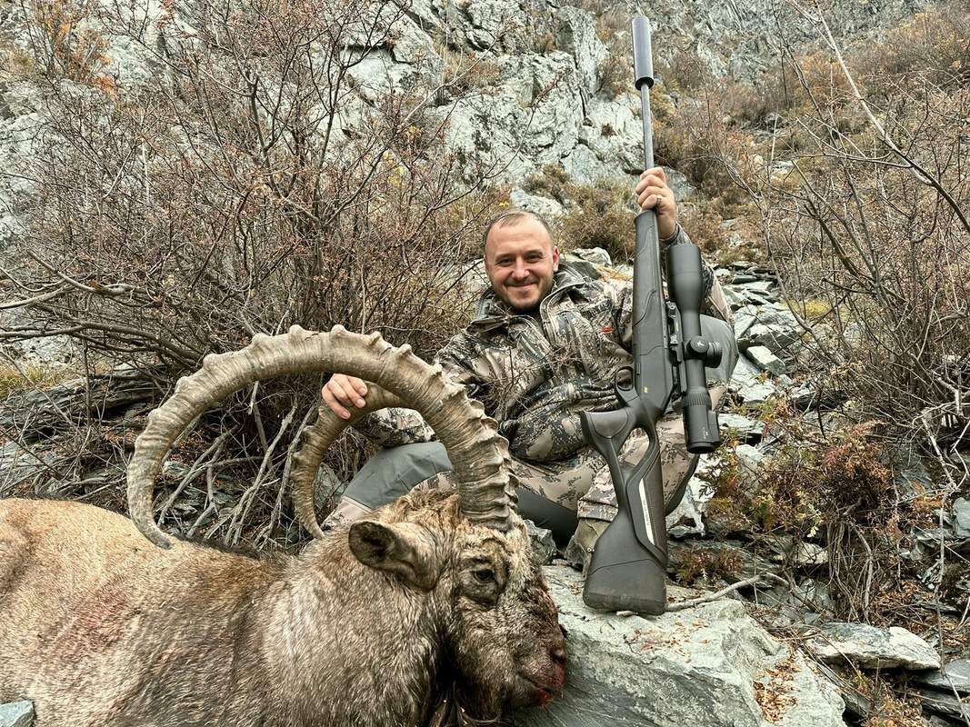Поднявшись повыше, я подготовил к стрельбе свой Blaser R8 .300 Win. Mag., снаряжённый пулей Hornady A-Max (патроны я заряжаю сам). Минут через 20 прогремел выстрел Игоря. Прошло всего несколько секунд, и козероги появились в поле зрения на расстоянии примерно 120 м. Вскинув карабин к плечу, я стал быстро высматривать в оптику наиболее крупного. Самцов было не меньше десятка, и все с трофеями очень неплохого качества. Но самым крупным оказался тот, который замыкал эту группу снизу. Поскольку расстояние было незначительное, стрелял с рук и первым же выстрелом попал ему в шею, куда и целился. Зверь упал и больше не шевелился.