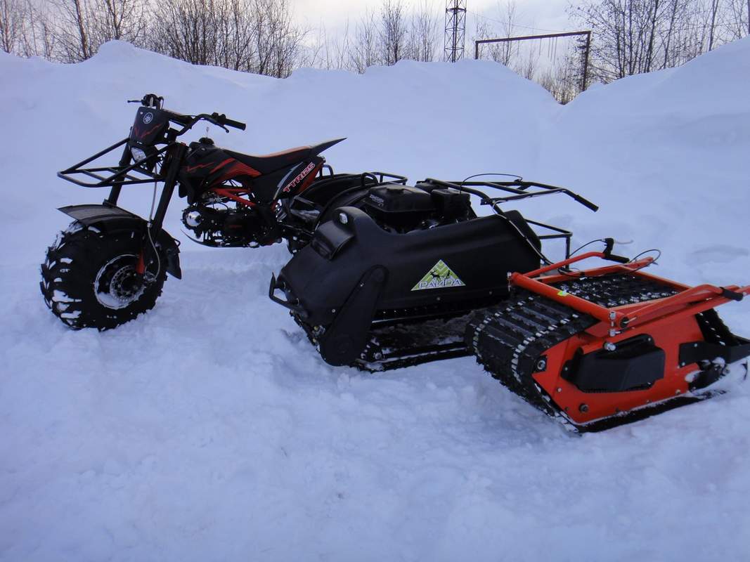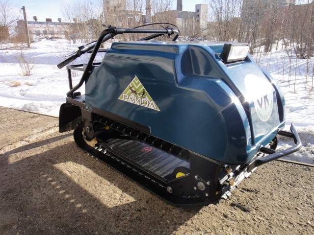 – Нет, они вообще некапризные, очень хорошие. Мощность – от 6 до 18 л. с. Гусеница «Композит», Курск, а сейчас появились рыбинские. Катки взаимозаменяемы с «Бураном», это важно, «Буран» – самый главный снегоход у нас. Подвеска оригинальная. Проверяли разные ходовые подвески, много всего наизобретали, и вот последняя разработка – подвеска полностью освобождена от всего лишнего. И она мягкая очень, у неё увеличено пятно контакта. То есть она по проходимости на порядок лучше, чем остальные буксировщики. Ход подвески 100 мм.