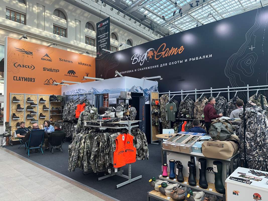 Вообще, должен сказать, что в условиях СВО ассортимент представленных на выставке изделий сильно качнулся в сторону «военки». Минимум на пяти стендах демонстрировались средства индивидуальной защиты, было как минимум четыре производителя дронов, на трёх-четырёх стендах активно рекламировались средства обнаружения БПЛА и защиты от них. Тем не менее традиционная охотничья составляющая присутствовала. Были аутфитеры с Камчатки, из Хабаровского края, Белоруссии, Воронежской области, компания «Валдайская Усадьба», крупнейший организатор охот по всему миру Profihunt. Были даже настоящие «африканцы» – Zelda Safaries, организаторы охот в Намибии. Первый раз за несколько лет самостоятельный стенд представил Московский клуб «Сафари», поражавший забредающих неофитов чучелами экзотических крупных животных. Рядом с нашим стендом располагалась компания «Аника», производящая топоры, пользующиеся заслуженным спросом у охотничьей братии.