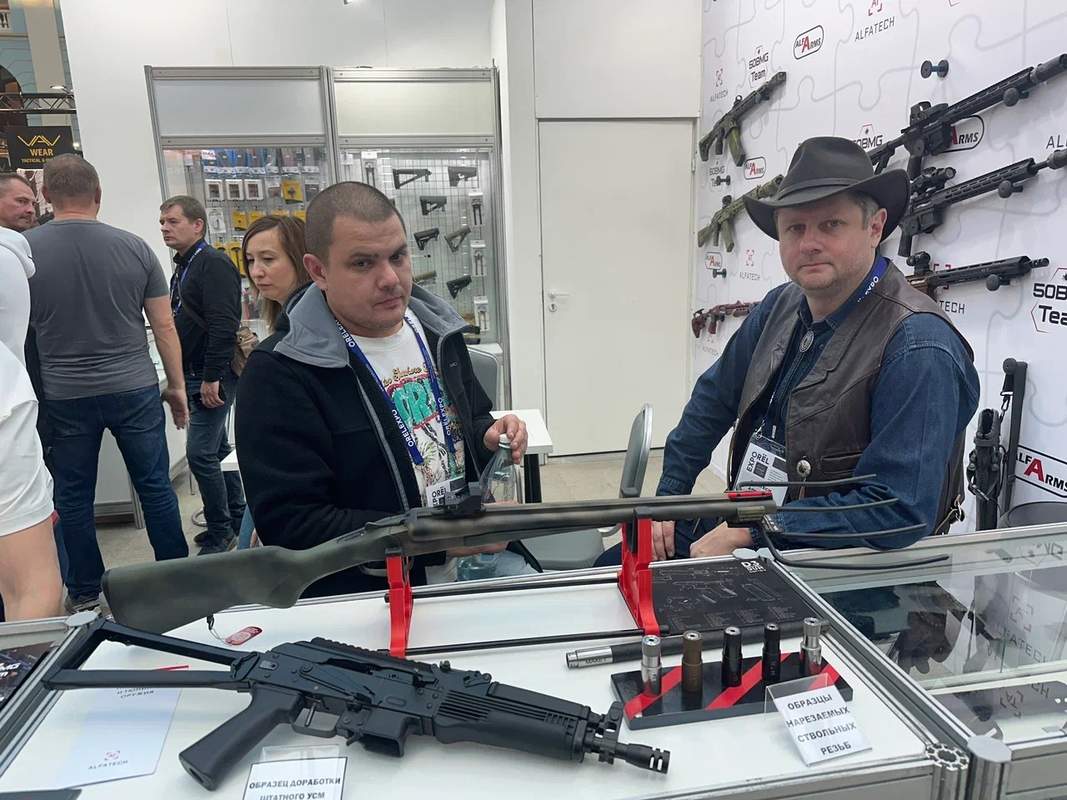 Достаточно было и отечественных производителей оружия. В том же первом ряду слева по краю зала находился павильон компании «Союз-ТМ», выступавшей под лозунгом «Союз-ТМ – оружие чемпионов», с их набором самозарядных винтовок, изготовленных по типу AR. Гвоздём программы у них стал карабин с гибридным приводом автоматики перезаряжания, имеющий преимущества как системы прямого действия газов на затвор, так и принципа с коротким ходом поршня, при этом лишённый недостатков обоих систем. Вообще, как и на двух предыдущих выставках, рулили «арочники»: кроме «Союз-ТМ», полноценные павильоны имели Sport Weapon Custom и Alfa Tech. На стенде Alfa Tech всех поражал тактической двустволкой с примкнутыми вилами Алексей Гезин aka Johnni First, что не исключало тюнингованных АКМоидов и AR-коидов за его спиной. Сам же он представлял освоенную компанией технологию обмотки стволов карбоновой лентой. Карабин по системе AR на выставке показала и компания Лобаева.