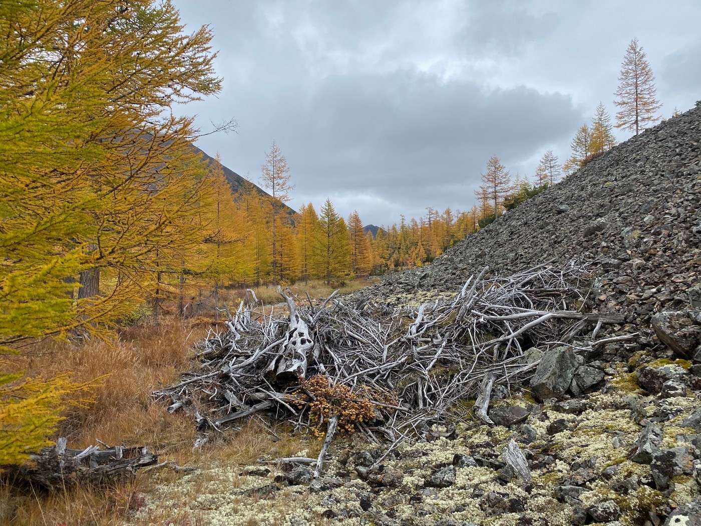 Решили пойти в другую сторону от реки. За какое-то время вышли на высоту в 1600 м, на самый верх огромного цирка, традиционно каменистого и без особой растительности. Но ничего за весь день так и не увидели. Хотя довольно свежие и внушительные лёжки и другие следы жизнедеятельности полорогих попадались на глаза постоянно. Складывалось ощущение, что мы их обнаружить не можем, поскольку они нас заранее слышат и скрытно сваливают с насиженных мест. Практически все лёжки располагались прямо посереди каменистого склона, на котором с расстояния свыше 1 км лежащего барана заметить просто нереально. Вообще, бараны характерны своими нестабильными локациями: то они внизу на грибах, то наверху спасаются от гнуса, то посредине горы просто так тусуются. А гнус, кстати, появлялся на любой высоте сразу, как только выглядывало солнце. Либо дождь, либо гнус, в общем. Пробиноклевали мы в три пары глаз весь день абсолютно безрезультатно.