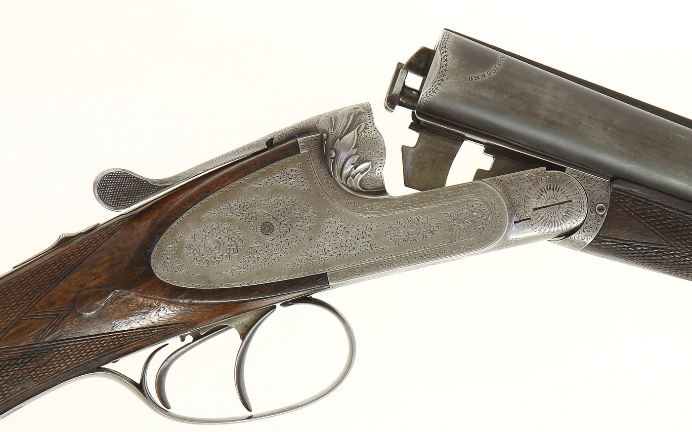 В пользовании охотника-гончатника имеется уникальный экземпляр бескуркового ружья 12-го калибра. Замки подкладные Бразье на боковых досках, на правой и левой доске – Alfred Dzikowski we Lwowie. Запирание стволов тройное Пёрде. Стволы английской стали, на прицельной планке подпись Henry Atkin from Purdey's, Jermyn St., London. Длина стволов 730 мм, дульные устройства – «чок – чок»; длина патронников 70 мм; вес ружья 3,3 кг. На поверхностях коробки, замочных досок и предохранительной скобе орнаментальный узор Roses & Scroll. Испытательные и информационные клейма лондонские. Ложа тёмной ореховой древесины с прямой шейкой. Цевьё пружинное системы В. Энсона с кнопочным управлением.