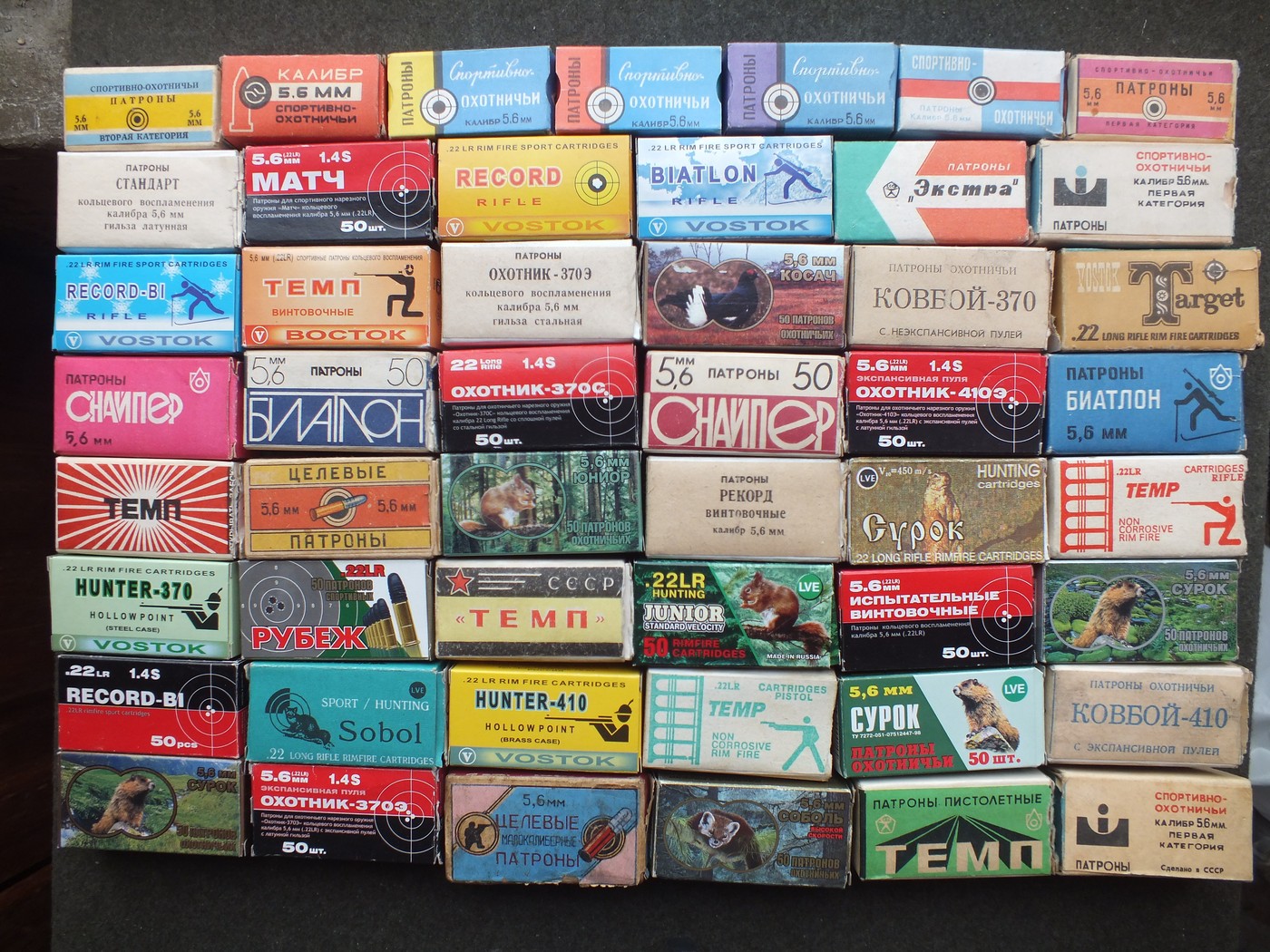 В 20–30-е годы изготовлением малокалиберных патронов в СССР занимались два подмосковных завода: в Кунцево (ныне район на западе Москвы) и в подмосковном Подольске. Первый был основан в 1900 г. Русско-Бельгийским акционерным обществом патронных заводов как небольшой частный пистонный завод. После революции предприятие было национализировано и получило наименование «Красный снаряжатель», а в 1933 г. ему был присвоен № 46. Второй – Подольский патронный завод – был основан в 1918 г. на базе эвакуированной части Петербургского патронного завода, с 1.10.1927 переименован в завод № 17. В то время оба они входили в Трест по производству патронов, трубок и взрывателей (сокращённо «Паттрубвзрыв», или ПТВ). Это название и указывалось на патронных коробках. До середины 30-х годов гильзы всех наименований малокалиберных патронов изготавливались исключительно из латуни Л68 производства Тульского патронного завода, латуни Л62 или томпака Кольчугинского металлопрокатного завода. Для охотников производились 5,6-мм патроны с гильзой длиной 7 мм (типа Flobert) со сферической или конической пулями, с гильзой длиной 10,5 мм типа .22 Short с оживальной или со сферической пулей, с гильзой длиной 15 мм типа .22 Long, .22 LR с оживальной и со сферической пулей. Для проведения спортивных соревнований использовались патроны типа .22 LR, как правило, германского или американского производства из-за низкого качества отечественных.