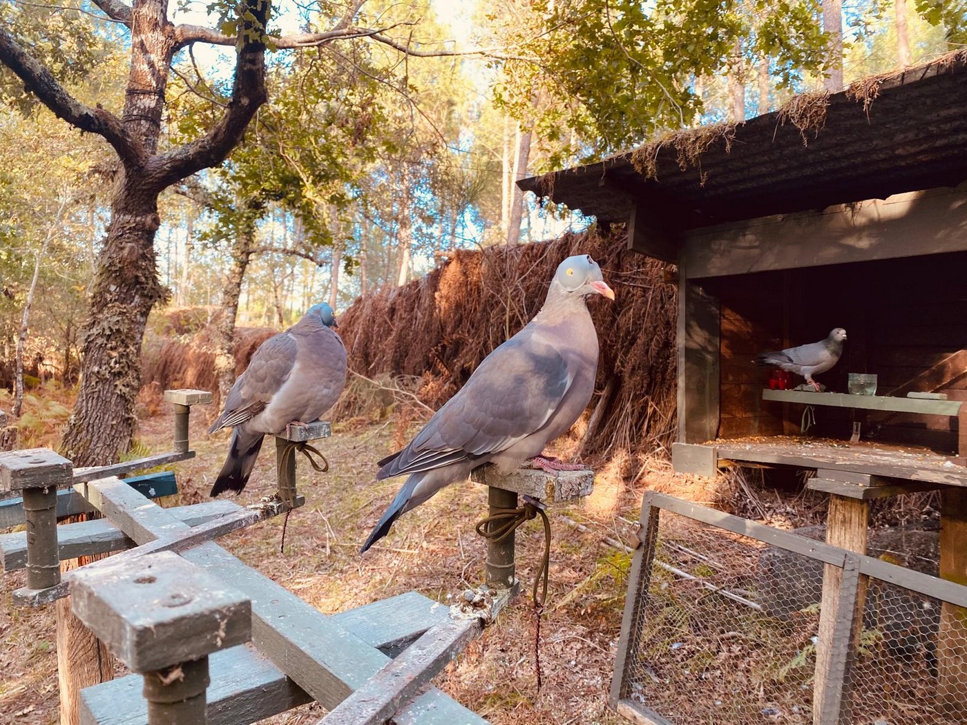 Наверху вышек тоже располагаются своего рода скворечники. В них залезают охотники для того, чтобы натягивать сетки, а также для того, чтобы снижать голубей во время полёта. Голуби обычно летят на высоте 100 м и выше, поэтому охотникам необходимо снизить птиц до нужных 40–50 м, чтобы они угодили в сети. Для этого пиренейцы швыряют из скворечников смешные приспособления, чем-то похожие на ракетки для настольного тенниса и летающие как фрисби. Эти штуковины чем-то напоминают по полёту ястребов, которые охотятся на голубей. Вяхири в панике снижаются, чтобы уйти от преследования, и попадают в сети. Говорят, что таких охотников за «лазурной лихорадкой» в Пиренеях осталась пара сотен человек. Уж больно затратна по времени подготовка, и всё меньше молодёжи хочет к ней приобщаться.