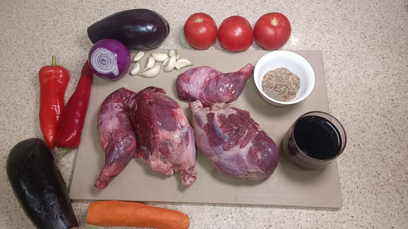 Для приготовления 1,5 кг бобрятины потребуется 3–4 крупных помидора, два сладких перца типа «ромеро», 2 больших баклажана, одна большая морковка, одна большая красная луковица, 200 мл красного сухого вина, 8–9 зубчиков чеснока, столовая ложка с горкой сухой приправы (хмели-сунели или «итальянских» или «французских» трав), соль и чёрный свежемолотый перец по вкусу, 1 большой лимон или виноградный уксус для вымачивания, растительное масло для обжаривания.