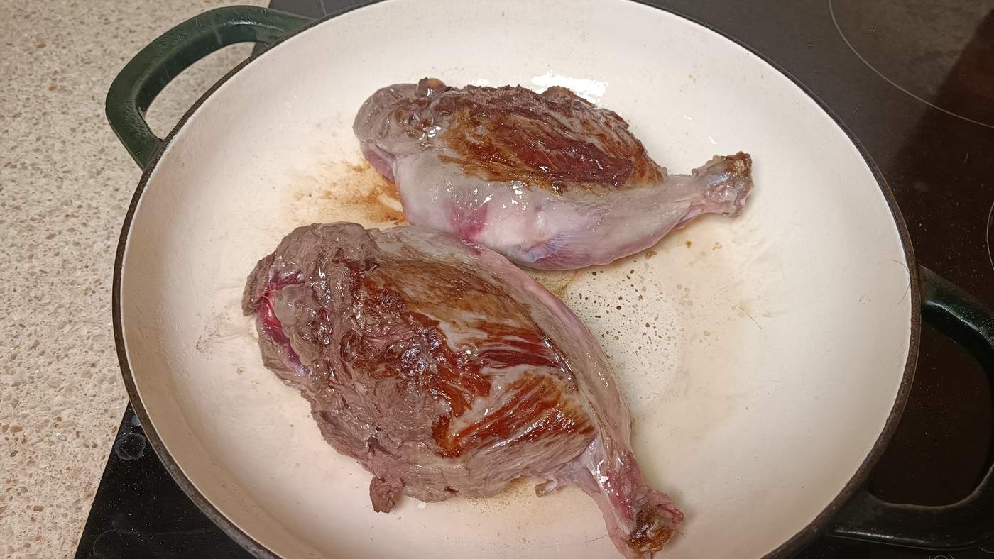 После вымачивания тщательно обсушите куски или кусочки кухонным полотенцем и слегка обжарьте на разогретом масле. Не стремитесь полностью прожарить кусочки: ваша задача состоит в том, чтобы получить румяную корочку. Сложите все обжаренные куски и кусочки в ёмкость для тушения, влейте вино и равное количество воды, закройте крышкой и потушите при слабом (пузырьковом) кипении 1 час.